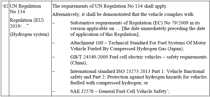 歐盟新的汽車安全框架性技術(shù)法規(guī)中,還有一個令人十分關(guān)注的內(nèi)容,就是在歐盟汽車整車型式批準應(yīng)滿足的各單項技術(shù)法規(guī)項目表,在氫能系統(tǒng)這一項目應(yīng)滿足的具體技術(shù)法規(guī)上,引用了中國的國家標準GB/T 24549-2009 《燃料電池電動汽車 安全要求》,將中國國家標準列為與聯(lián)合國法規(guī)UN R134、歐盟技術(shù)法規(guī)、日本技術(shù)法規(guī)、ISO 23273-2013和美國SAE J2578對等的標準法規(guī)項目,即意味著產(chǎn)品在氫能和燃料電池項目上,只要滿足包括中國國標在內(nèi)上述的5個標準法規(guī)之一,即在該項目上獲得歐盟的產(chǎn)品型式批準。這是中國汽車標準首次被采用寫入以歐美為代表的國際主流汽車技術(shù)法規(guī)中,在歐盟的汽車型式批準體制中成為與歐、美、日法規(guī)完全對等的標準法規(guī)。
