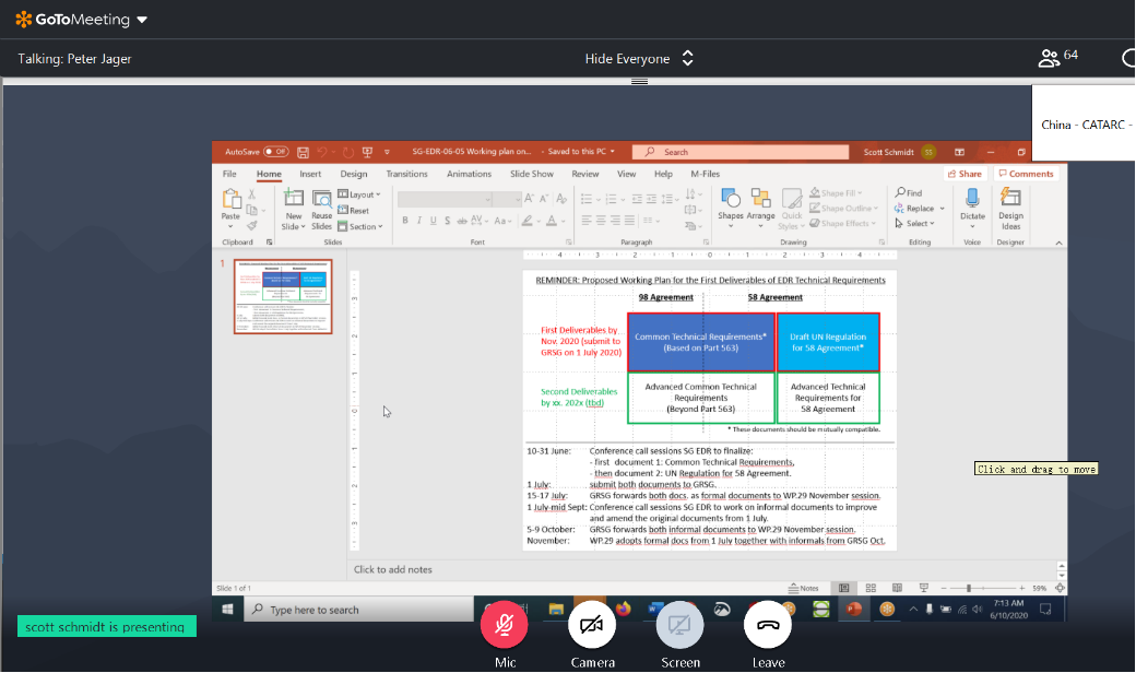 北京時(shí)間2020年6月10日,聯(lián)合國(guó)WP.29 汽車(chē)事件數(shù)據(jù)記錄系統(tǒng)(EDR)國(guó)際法規(guī)起草組第6次會(huì)議(SG-EDR-06)以網(wǎng)絡(luò)會(huì)議形式召開(kāi)。來(lái)自中國(guó)、荷蘭、日本、美國(guó)、德國(guó)、法國(guó)、英國(guó)、韓國(guó)等WP.29締約方政府和歐盟委員會(huì)(European Commission,EC)的專(zhuān)家以及國(guó)際汽車(chē)制造商組織(OICA)、歐洲汽車(chē)零部件供應(yīng)商聯(lián)合會(huì)(CLEPA)、國(guó)際汽車(chē)檢測(cè)協(xié)會(huì)(CITA)等組織的專(zhuān)家總計(jì)60余人參加了本次會(huì)議。中國(guó)汽車(chē)技術(shù)研究中心有限公司孫枝鵬、吳含冰、張廣秀、鄭英東、馬汶鍇,吉利汽車(chē)研究院(寧波)有限公司佟洋,上海汽車(chē)集團(tuán)股份有限公司武學(xué)輝,司法鑒定科學(xué)研究院潘少猷共8人代表中國(guó)參會(huì)。