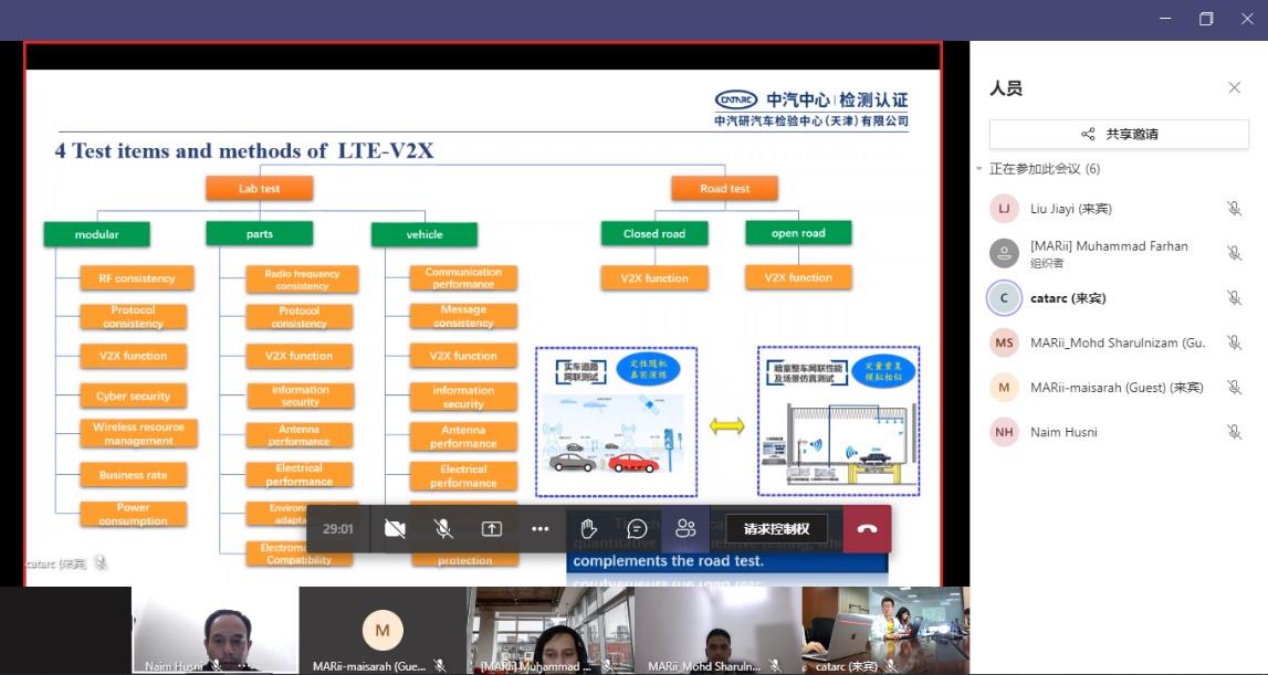 會(huì)上,檢測(cè)認(rèn)證事業(yè)部工程師俞彥輝首先對(duì)國(guó)內(nèi)及CATARC智能網(wǎng)聯(lián)汽車試驗(yàn)場(chǎng)建設(shè)的整體情況作了全面介紹,隨后分享了各測(cè)試場(chǎng)景下的相關(guān)測(cè)試方法,重點(diǎn)對(duì)LTE-V2X的測(cè)試項(xiàng)目和方法進(jìn)行了講解,同時(shí)還展示了CATARC在智能網(wǎng)聯(lián)領(lǐng)域較為全面的檢測(cè)能力。中汽數(shù)據(jù)有限公司工程師魏文淵對(duì)天津(西青)國(guó)家級(jí)車聯(lián)網(wǎng)先導(dǎo)區(qū)的整體情況作了詳細(xì)介紹,包括整個(gè)先導(dǎo)區(qū)的建設(shè)規(guī)劃、測(cè)試能力以及各類測(cè)試場(chǎng)景。在馬方演講環(huán)節(jié)中,MARii首席技術(shù)官M(fèi)r. Mohd Sharulnizam Sarip對(duì)馬來(lái)西亞下一代汽車(NxGV)測(cè)試平臺(tái)的建設(shè)情況做了整體介紹,同時(shí)對(duì)賽城(Cyberjaya)的智能網(wǎng)聯(lián)汽車應(yīng)用場(chǎng)景作了深入分享。在雙方自由交流環(huán)節(jié)中,MARii與CATARC就自動(dòng)駕駛汽車試驗(yàn)場(chǎng)及相關(guān)領(lǐng)域,進(jìn)行了廣泛而深入的交流,MARii高度認(rèn)可CATARC在自動(dòng)駕駛汽車試驗(yàn)場(chǎng)地建設(shè)及應(yīng)用方面已經(jīng)取得的成果及未來(lái)規(guī)劃。