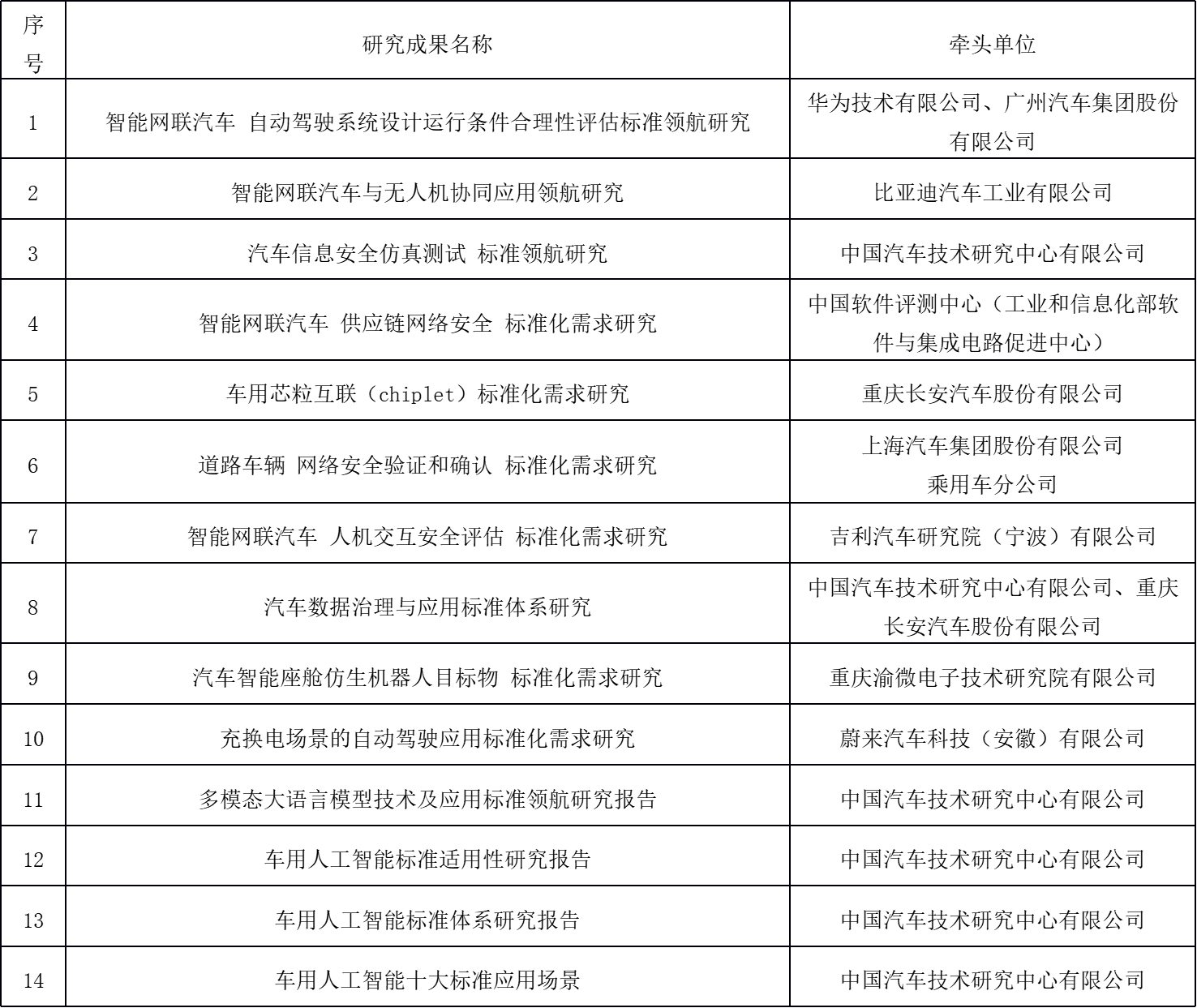 為貫徹落實(shí)《國(guó)家標(biāo)準(zhǔn)化發(fā)展綱要》《國(guó)家車聯(lián)網(wǎng)產(chǎn)業(yè)標(biāo)準(zhǔn)體系建設(shè)指南(智能網(wǎng)聯(lián)汽車)》等文件要求,確保智能網(wǎng)聯(lián)汽車標(biāo)準(zhǔn)體系的前瞻性,充分發(fā)揮標(biāo)準(zhǔn)對(duì)技術(shù)及產(chǎn)品的引領(lǐng)作用,2025年全國(guó)汽車標(biāo)準(zhǔn)化技術(shù)委員會(huì)智能網(wǎng)聯(lián)汽車分技術(shù)委員會(huì)(SAC/TC114/SC34)秘書處立足產(chǎn)業(yè)發(fā)展實(shí)際與技術(shù)創(chuàng)新趨勢(shì),統(tǒng)籌利用行業(yè)優(yōu)勢(shì)資源,組織開展了一系列智能網(wǎng)聯(lián)汽車標(biāo)準(zhǔn)化領(lǐng)航及需求研究項(xiàng)目,內(nèi)容涵蓋無(wú)人機(jī)協(xié)同、人機(jī)交互、車用人工智能等前沿技術(shù),形成了相應(yīng)的成果(見表1)。